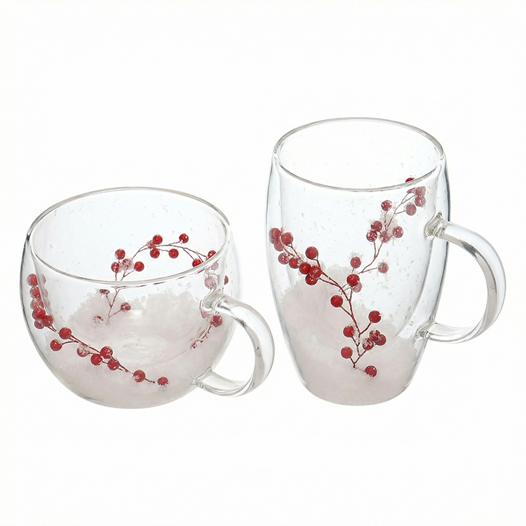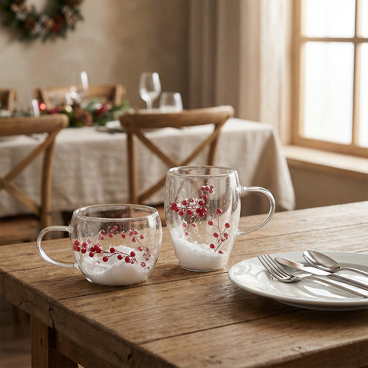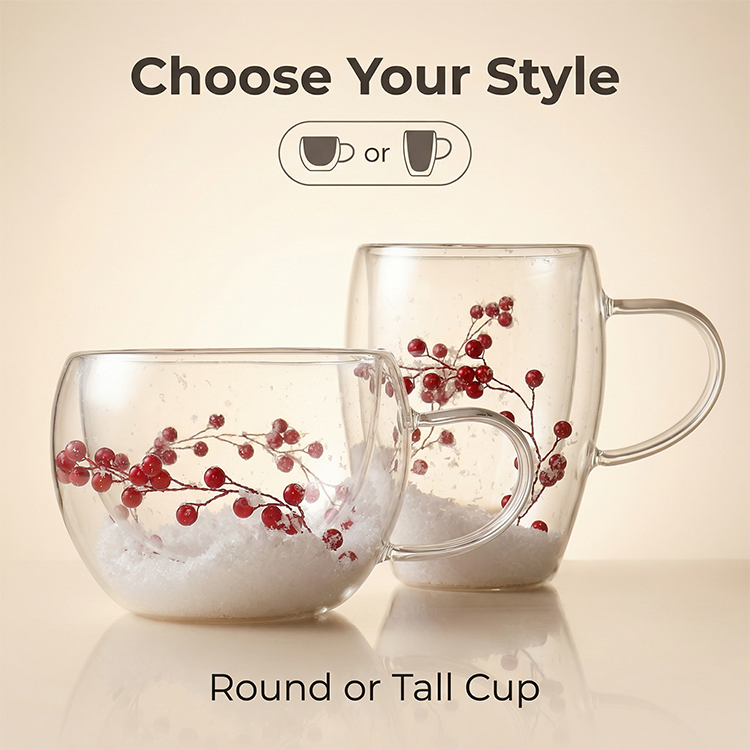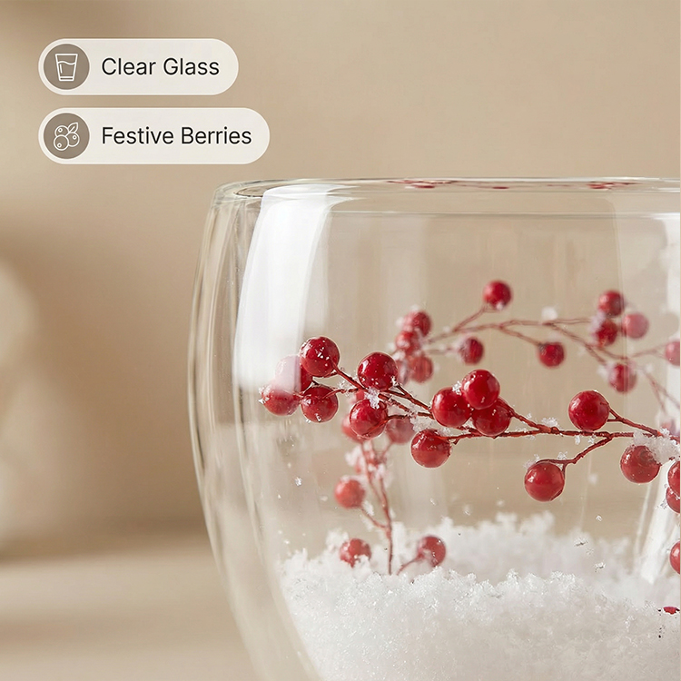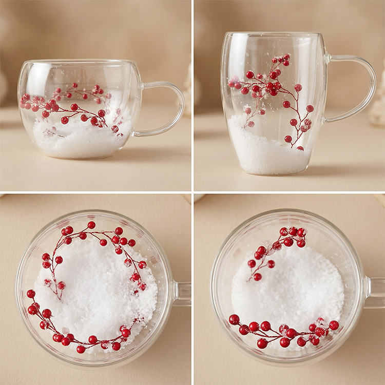 Each mug is filled with realistic snowflake-like material and adorned with delicate red berry branches, bringing a warm winter atmosphere indoors. Whether you're entertaining guests during the holidays, enjoying a quiet morning by the fireplace, or looking for a thoughtful festive gift, this festive design makes every drink feel like a celebration.