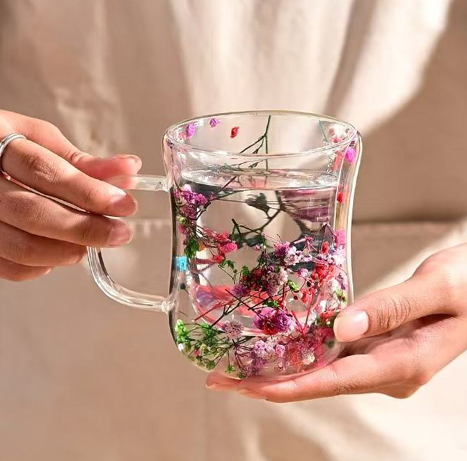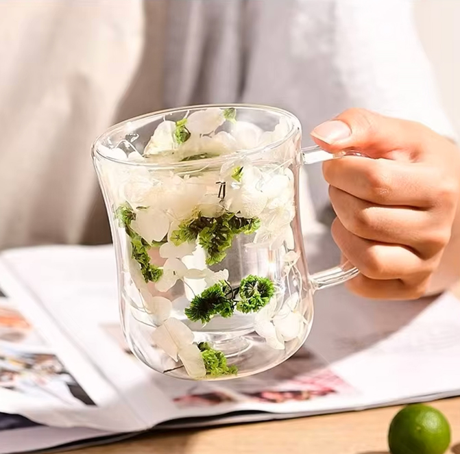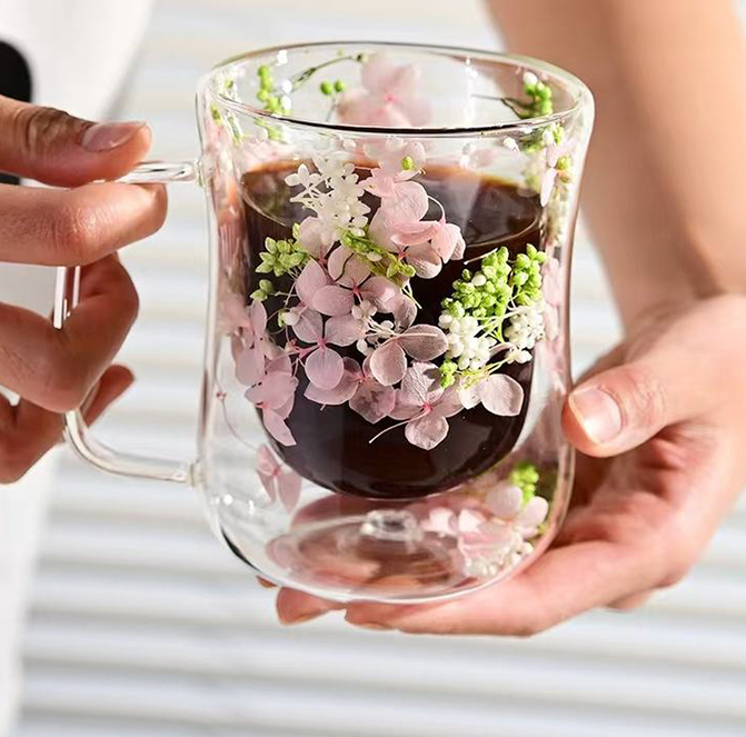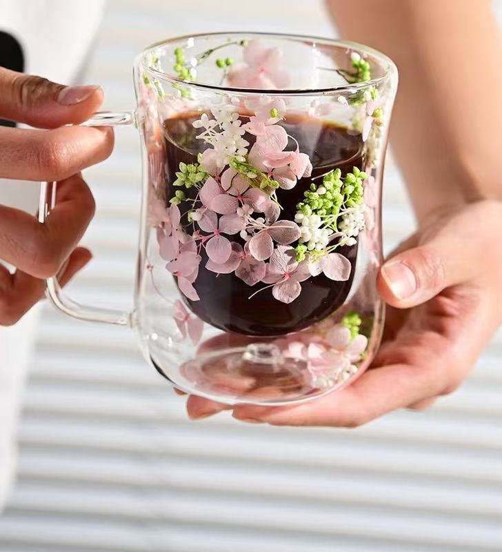 This uniquely designed mug perfectly combines the beauty of real flowers with the practicality of double-walled glass technology, offering you a refined experience for enjoying both hot and cold beverages. Whether it's tea, coffee, or other drinks, this mug is a perfect blend of art and functionality.