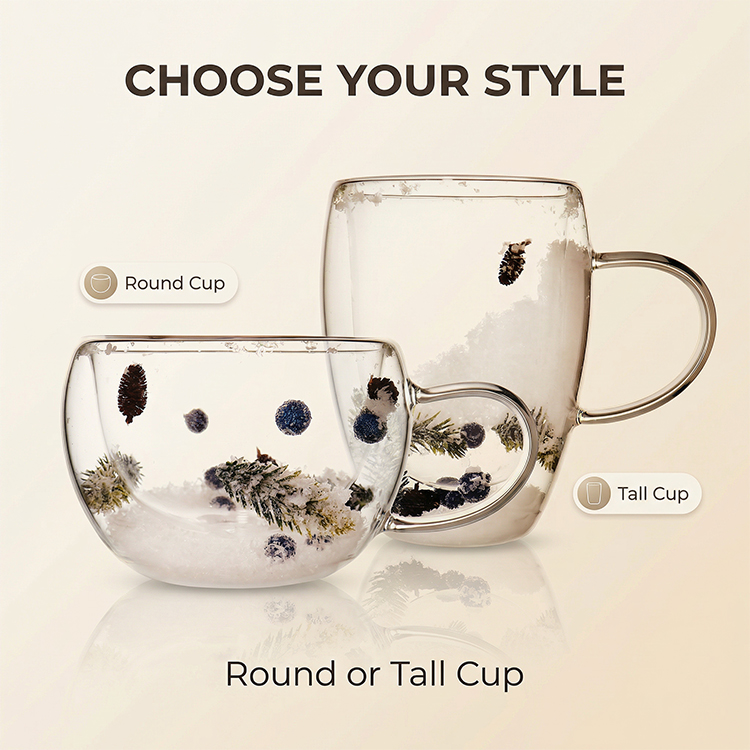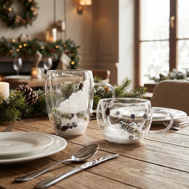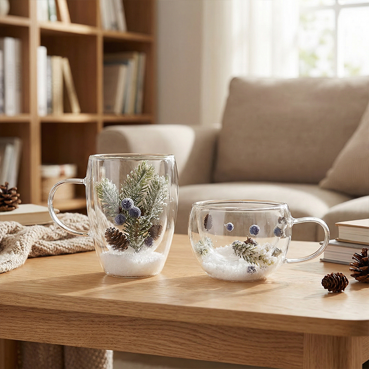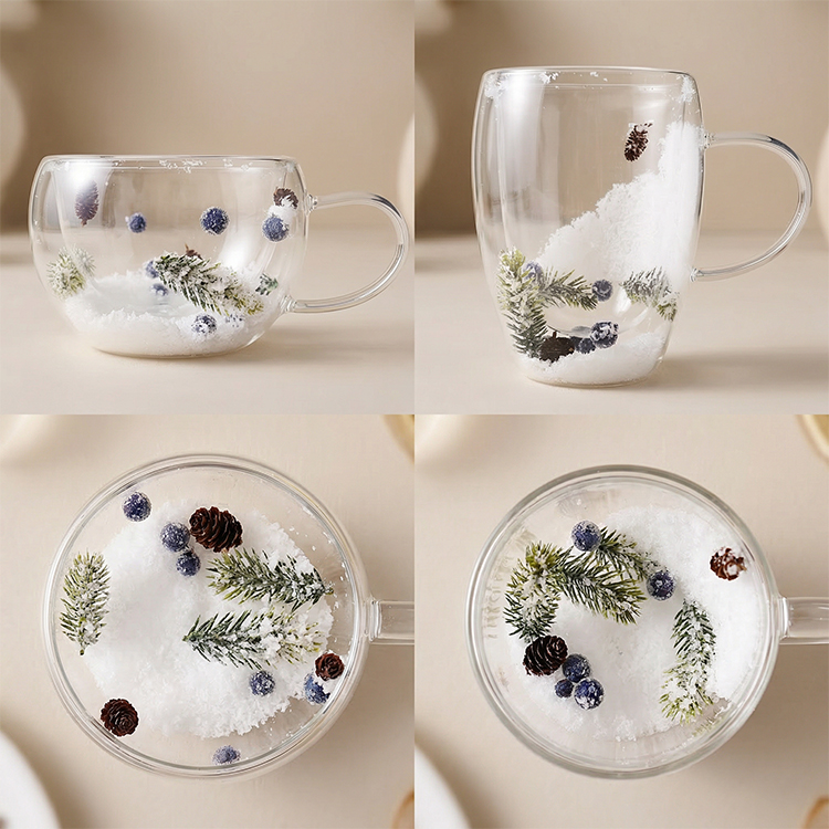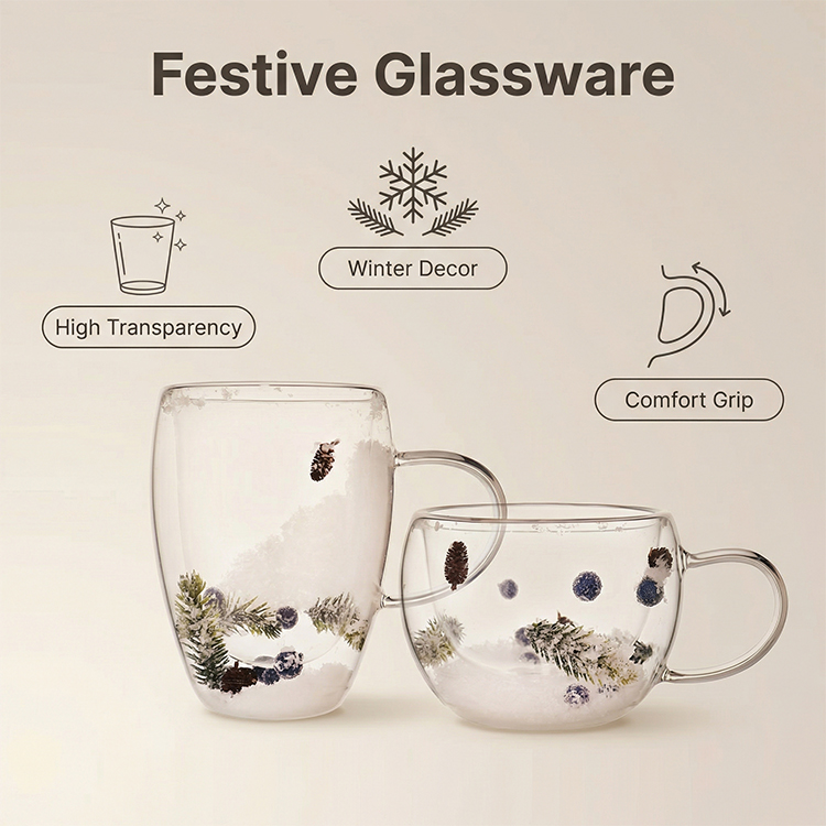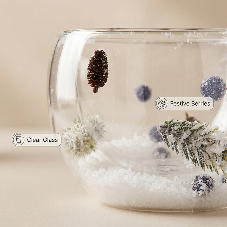 Each glass is filled with realistic snowflake-like material and adorned with delicate red berry branches, bringing a cozy winter atmosphere indoors. Whether you're entertaining guests during the holidays, enjoying a peaceful morning by the fireplace, or looking for a thoughtful festive gift, this holiday design will infuse every drink with the spirit of the season.